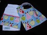 Functional, unique and stylish gift set that includes one burp cloth and one bib which are handmade in Richmond, Virginia from original Owen & Amelia patterns. The Caroline gift set is a vintage inspired fruit pattern and is finished with a red and pink lollipop trim. Cut for broad coverage (approx. 9 1/2 x 14), the bib also features large double snaps (approx. 5/8 each) which adjust the neck size from newborn to toddler. Plush white terry cloth covers the back of the bib to wipe off little faces. The burp cloth is an oversized (approx. 14 x 19) 100% cotton cloth diaper that accommodates for the messiest adventures.
