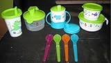 Toddler Tumbler? 6-oz./180 mL capacity.? Includes handle and cover.Sippy Cup? 7-oz./200 mL capacity.? Includes Sipper Seal Domed Cover to minimize spills.Snack Cup? 4-oz./120 mL capacity.? Virtually liquid-tight seal makes it safe to carry in bag or purse.Feeding Cup with handle? 8-oz./250 mL capacity.? Virtually liquid-tight seal makes it safe to carry in bag or purse.Feeding Spoons? Set of four.? Unique handles let you balance them on the edge of a cup or bowl.Formula Dispenser? 30-oz./887 mL capacity.? Divided container houses the correct amount of formula in each of the three compartments.? Simply rotate seal to compartment you wish, remove cap from spout and dispense whichever formula you choose.