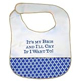 The perfect bib to dress up your darling's outfit at synagogue or dinner with grandma. Made in the USA of vinyl impregnated cotton. Large 9 x 9" coverage area with a pocket to catch small pieces running across the bottom. Front wipes clean. Machine wash cold, gentle cycle; line dry.
