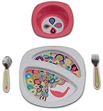 - Includes plate, bowl, fork and spoon that are designed for self-feeding success